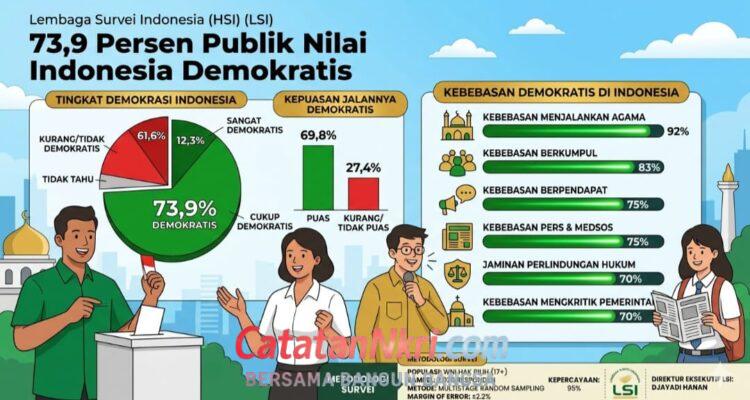 Demokrasi RI Survei LSI: Demokrasi RI Dapat Dukungan 73,9 Persen Warga News|April 13, 2026by admin Jakarta – Mayoritas masyarakat Indonesia menilai sistem politik di Tanah Air masih