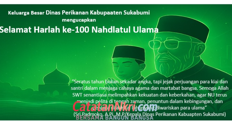 Keluarga Besar Keluarga Besar Dinas Perikanan Kabupaten Sukabumi Mengucapkan Selamat Harlah ke-100 Nahdlatul Ulama Dinas, KARTU UCAPAN, News, Perikanan|January 31, 2026by admin CatatanNKRI.com,- Sukabumi, 31 Januari 2026 – Dalam semangat Sukabumi Mubarokah yang menjiwai