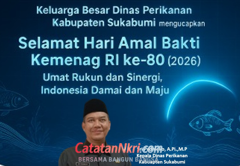 CatatanNKRI.com,- Sukabumi, 3 Januari 2026 – Keluarga Besar Dinas Perikanan Kabupaten Sukabumi dengan penuh syukur dan semangat Sukabumi Mubarokah menyampaikan ucapan selamat atas peringatan Hari Amal Bakti Kementerian Agama Republik Indonesia ke-80. Momentum ini menjadi pengingat bahwa kerukunan umat dan sinergi lintas sektor adalah fondasi bagi Indonesia yang damai dan maju.