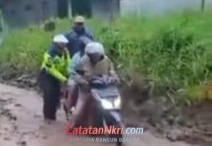 Melihat situasi tersebut, personel Polantas yang berada di lokasi tanpa menunggu alat berat langsung turun membantu. Bersama warga sekitar, petugas mendorong kendaraan satu per satu agar bisa keluar dari kubangan lumpur.