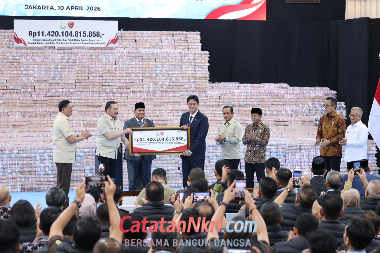 Pada Jumat (10/4) ini, Kejaksaan Agung menyerahkan pengenaan denda administratif dan pemulihan kerugian akibat aktivitas ilegal di dalam kawasan hutan sebesar Rp 11,42 triliun yang disaksikan Prabowo. Ini merupakan hasil penindakan periode Januari-April 2026 yang berasal di antaranya dari denda administratif, PNBP penanganan tindak pidana korupsi, setoran pajak, dan PNBP denda lingkungan hidup.
