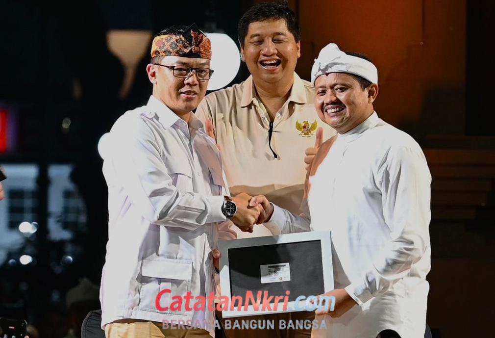 Sekjen DPP Partai Gerindra Sugiono resmi memberikan kartu tanda anggota kepada Bupati Sumedang Dony Ahmad Munir pada Jumat malam (13/02/2025).