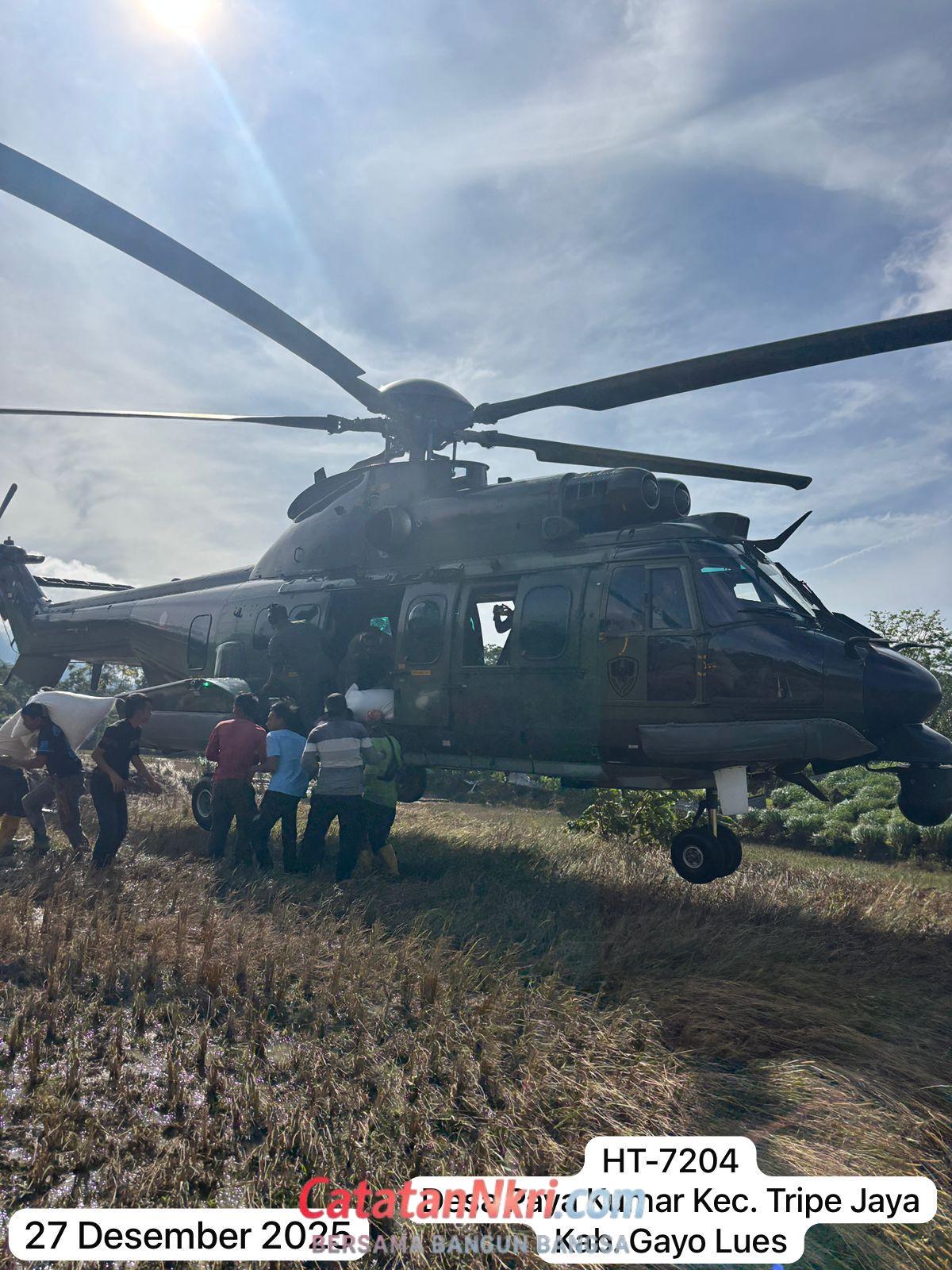 CatatanNkri.com, Aceh — TNI Angkatan Udara (AU) kembali menerjunkan dua helikopter untuk mendistribusikan bahan pangan di lokasi terdampak bencana banjir bandang dan longsor di Aceh, Sabtu (28/12). Dua unit helikopter tersebut mengangkut logistik ke tujuh desa di tiga kabupaten yang tersebar di provinsi tersebut.