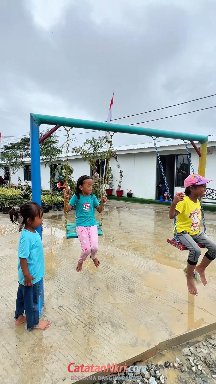 Anak-anak menjadi potret paling jujur dari kebahagiaan itu. Mereka berlarian, bermain ayunan di taman bermain yang tersedia, sesuatu yang sebelumnya tak pernah mereka rasakan selama tinggal di tenda darurat. Beberapa anak bahkan tak kuasa menahan kegembiraan, melompat-lompat di atas kasur yang sudah rapi dan bersih di dalam hunian. Pemandangan sederhana, namun sarat makna: rasa aman akhirnya kembali.